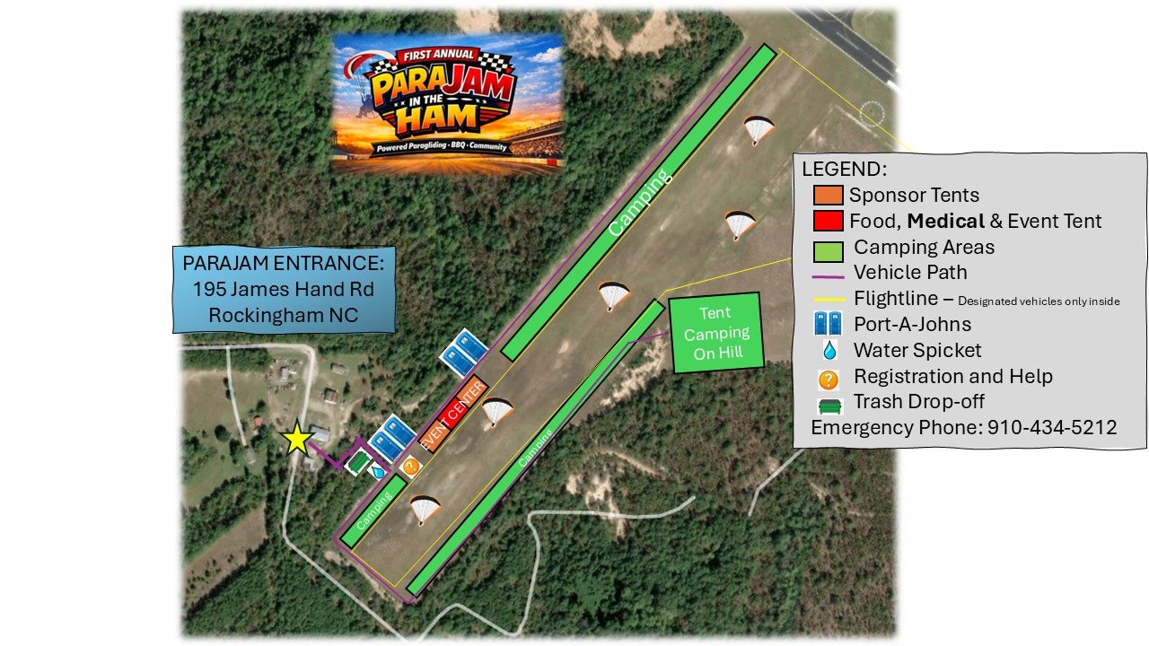 This combined map covers event entrance, sponsor and event areas, camping zones, vehicle flow, flightline boundaries, water, registration, trash, and emergency contact.